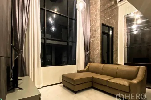 This stylish 1-bedroom, 1-bathroom condominium offers 37 sq m of optimized loft living in Sathon, Bangkok. A dramatic double-height living room features floor-to-ceiling windows with sweeping city views, elegant drapes, and globe pendant lighting over an L-shaped sofa. The sleek kitchenette comes equipped with a full-size refrigerator, microwave, induction hob, and an in-unit washing machine. A modern bathroom includes a glass-enclosed shower and generous mirror, while the cozy loft bedroom overlooks the lounge via a glass balustrade.