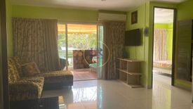 A fully furnished 1-bedroom apartment located on the 1st floor in a resort-style condominium surrounded by greenery and pools. The layout includes a living room combined with a kitchen and dining area, a bedroom, a bathroom, and a balcony.