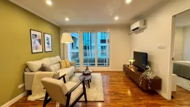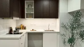 This bright 1-bedroom, 1-bathroom Condominium for sale offers 56 sq m of usable space (approx. 14 sq wah or 0.035 rai) in Watthana, Bangkok. The living area features warm hardwood floors, recessed lighting, and large sliding doors opening to a private balcony. A wall-mounted TV console keeps the space sleek and tidy, while a soft-toned sofa set and nested coffee tables create a relaxing lounge. The separate kitchenette presents white countertops paired with dark wood cabinetry, an induction cooktop, and a sink—ideal for quick meals and everyday convenience.