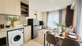 This modern 1-bedroom, 1-bathroom condominium for rent offers 48 square meters of comfortable living in Watthana, Bangkok. The open-plan layout features a bright living area with large windows, a cozy sofa set, TV console, and a dining table for four. A neutral color palette, sheer curtains, and wood-style flooring create a calm, stylish atmosphere. The compact kitchenette is well equipped with an electric cooktop, sink, refrigerator, microwave, and an in‑unit washing machine for everyday convenience.