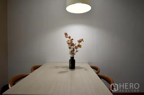 Move into a well-planned 2-bedroom, 2-bathroom condominium in Khlong Toei, only moments from BTS Ekkamai. The 60 sqm layout features a bright living room with built-in shelving and wood flooring, a cozy dining nook under a pendant light, and a practical kitchen with upper storage and countertop appliances. Enjoy the convenience of an in-unit washer and two modern bathrooms, one with a rain shower and the other with a relaxing bathtub. The serene bedrooms are styled with soft tones, artwork and ample storage.