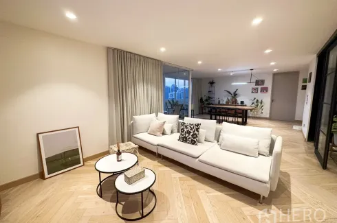 This contemporary 2-bedroom, 2-bathroom condominium offers 139 sq m of usable space (approx. 34.8 sq wah or 0.087 rai) in Watthana, Bangkok. The open-plan living and dining area features elegant herringbone wood flooring and floor-to-ceiling glass that opens to a broad balcony, framing sweeping skyline views and stunning sunsets. A bright study/vanity nook, a dedicated laundry room with washer and dryer, and a restful primary bedroom with extensive wardrobes enhance everyday comfort. The enclosed modern kitchen comes with a central island and bar seating, stylish patterned floor tiles, and a sliding glass partition for ventilation and noise control. Both bathrooms are freshly finished with glass-enclosed showers and floating vanities.