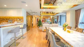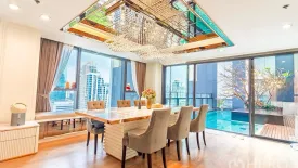 This luxury 3-bedroom, 4-bathroom condominium for sale in Sathon, Bangkok presents 228 sq m of refined living space. The open-plan lounge and dining area showcases floor-to-ceiling windows with dramatic skyline views, warm wood floors, mirrored coffered ceilings, and a custom media wall. A statement crystal chandelier crowns the large dining table, while a marble breakfast bar adds everyday convenience. Sliding glass doors connect to a rare private pool terrace with glass balustrade and a beautifully lit frangipani planter—an exceptional setting for entertaining or unwinding above the city.