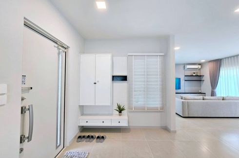 Modern detached house in Bang Phli, Samut Prakan with 184 sqm usable space on 62 sq wah of land (approx. 248 sqm or 0.16 rai). The home offers 3 bedrooms and 4 bathrooms, a bright open-plan living and dining area, and wide sliding doors that flow to a private garden and covered terrace. A glass-partitioned fitted kitchen features a hob and backsplash, while a handy study nook sits by the staircase. Built-in storage, quality flooring, and air-conditioning complete the move-in ready interiors.