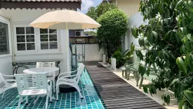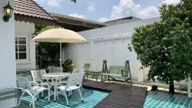 This charming detached house for rent in Saphan Sung, Bangkok offers generous living on a 50 sq wah plot with 150 sqm of usable space. The exterior features a pitched tiled roof, a private white fence, and a covered carport. A welcoming front porch with chandelier lighting and glass-paneled doors leads to an inviting outdoor zone. The highlight is a turquoise-tiled terrace with a wooden deck, umbrella-shaded seating, and mature greenery—ideal for relaxed alfresco dining and weekend gatherings.