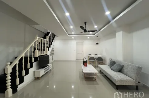 Move in to a bright 3-bedroom, 2-bath townhouse for rent in Khlong Toei, just moments from BTS On Nut. Offering 140 sq m of usable space on 23 sq wah of land (approx. 92 sq m or about 0.06 rai), this home features an open-plan living and dining area with cove lighting, ceiling fan and AC. A practical tiled kitchen provides ample counter space, cabinetry and a fridge, while a skylit stairwell connects to well-sized bedrooms and clean bathrooms with water heaters.
