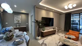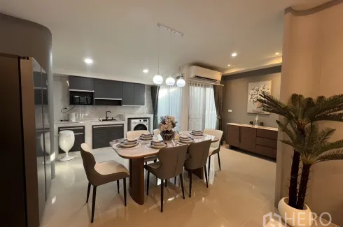 This contemporary 3-bedroom, 3-bathroom Townhouse for rent in Bang Phli, Samut Prakan offers 130 sq m of usable space on a 20 sq wah plot. The open-plan layout connects a chic living area and a dining zone to a sleek kitchen finished with marble-effect surfaces and matte grey cabinetry. Pendant lighting, a marble-top dining table, and full-height sliding glass doors with curtains create a bright, elegant ambiance. The lounge features a wall-mounted TV, built-in console, LED cove lighting, a modern curved sofa and coffee tables, while polished floor tiles and tasteful decor complete the look.