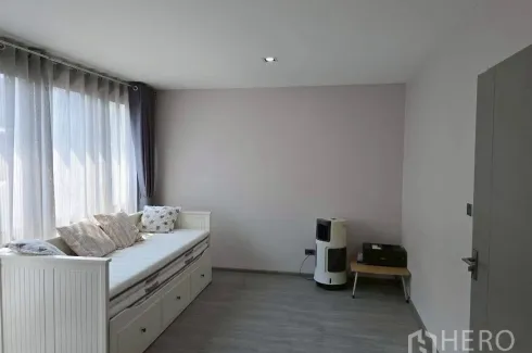 Contemporary end-unit townhouse in Lat Phrao, Bangkok offering 168 sq m of usable space on 31 sq wah of land. The home features 3 bedrooms and 4 bathrooms, a light-filled living area with built-in media wall, an elegant dining room with marble table and chandelier, a glass-enclosed kitchen, and a dedicated home office. Serene bedrooms include a generous master suite with custom storage and TV wall. A covered carport accommodates two cars.