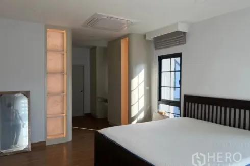 Modern detached house for rent in Bang Kaeo, Bang Phli, Samut Prakan. This bright family home offers 280 sqm of usable space on a 70 sq wah plot. The layout features 4 bedrooms and 5 bathrooms, an airy open‑plan living and dining area with herringbone floors, floor‑to‑ceiling windows, sheer curtains and cassette air‑conditioning. A sleek, fully fitted kitchen comes with extensive cabinetry and stone countertops. Bedrooms are restful with warm wood flooring, while the stylish tiled bathrooms include walk‑in showers. A compact study nook completes the practical family-friendly design.