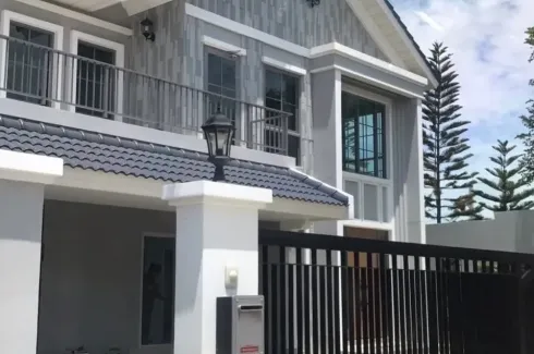 This modern two-storey detached house for rent sits in Bang Phli, Samut Prakan. Offering 230 sqm of usable space on 81 sq wah of land, the home features a secure black gate, paved frontage and a stylish gray facade with balcony detail. Inside, a bright main living room welcomes you with floor-to-ceiling windows, glossy tile floors and a grand double wooden entry. A separate lounge and a dining area open to large sliding doors, creating an airy flow for everyday living. The staircase is finished with a sleek glass-and-metal balustrade.