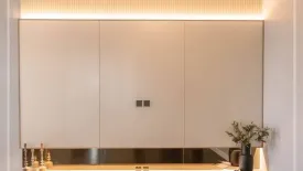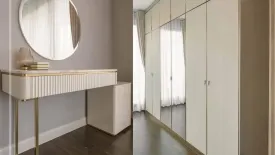 This luxury 5-bed, 6-bath Detached House for rent or sale sits in the Suan Luang district in the Bangkok province of Thailand. Offering 660 square meters of usable space on 95 square wah of land, the home showcases a dramatic double-height living room with floor-to-ceiling windows and a sparkling chandelier. A marble feature wall framed by warm wood accents and illuminated display cabinetry creates a refined focal point. The adjacent dining area is styled for entertaining, while the pantry/kitchen features sleek cabinetry, open shelving and soft lighting. Throughout the house, custom built-ins provide excellent storage including wardrobes, dressing areas and a chic vanity.