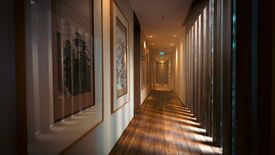 Reminiscent of Japanese tatami-style rooms, three single beds rest on an extended wooden raised platform, surrounded by framed watercolours of exotic birds. A great room for children, it has ceiling-high glass sliding doors that open onto a small private balcony with views of the garden’s tropical trees and plants.