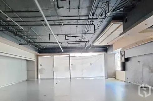 Prime 113 sqm retail space for rent in Bang Rak, moments from BTS Sala Daeng. The interior features an open-plan layout, high exposed ceiling with ducts and cable trays, smooth light flooring, and a wide glass frontage ready for branding—ideal for a café, showroom, clinic, or boutique seeking strong street presence and convenient transit access.