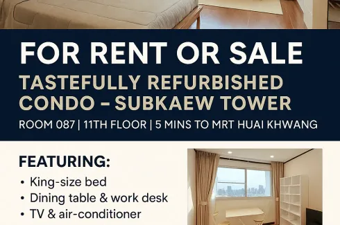 This property is a 31 SqM studio condo with 1 bathroom that is available for sale. It is part of the Subkaew Tower project in Huai Khwang, Bangkok and was completed in Jan 1995. You can buy this condo for a base price of ฿3,000,000 (฿96,900/SqM) and it is also available for long term rentals starting from ฿10,000 per month.
