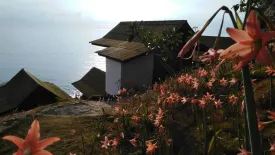 The land on the hillside away from the party area with green nature around the bungalow.
