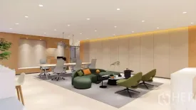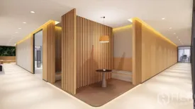 Move-in ready 111 sq.m. office on a high floor in Huai Khwang, delivered fully furnished for immediate productivity. The light-filled layout features a welcoming reception, shared visitor lounge, open-plan work zone, a bar-height counter by the windows, and an 8-seat meeting room with display. Warm wood accents, green walls, modern lighting and roller blinds create a professional, biophilic ambiance.