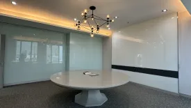 Modern and move-in ready Office Space for rent in Khlong Toei, Bangkok. The interior features a bright conference room with a large round table, a stylish chandelier, and glossy wall panels ideal for presentations. Full-height windows bring in natural light and frame sweeping skyline views. Entry is via frosted glass double doors, while durable carpet flooring, recessed lighting, and an acoustic grid ceiling ensure comfort and productivity throughout the day.
