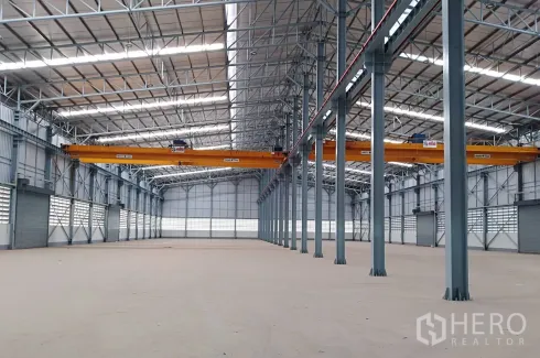 This heavy-spec warehouse for rent in Wang Noi, Phra Nakhon Si Ayutthaya offers 4,769 sq m of functional space on a land plot of 1,500 sq wah (approx. 6,000 sq m or about 3.75 rai). Engineered for demanding operations, the slab is rated to 5 tons per sq m, and the building is fitted with overhead traveling cranes to simplify lifting and handling. Inside, a clear, columned layout with steel trusses, skylight panels and louvered ventilation promotes efficient workflow and natural light, while multiple roller shutter doors perimeter for flexible access and circulation of goods.